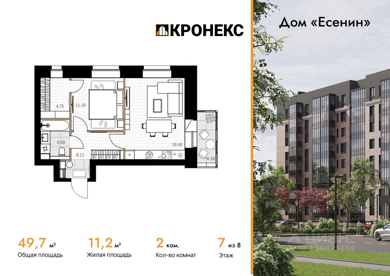 Продается 2-комн. кв-ра площадью 49.66 кв.м на 7 этаже 8 этажного кирпичного дома в Дом ''Есенин'' от ГК Кронекс. Добро пожаловать в авторский дом ''Есенин'' новое слово в городском комфорте. Обширная закрытая территория проекта граничит с сектором низкой застройки, что обеспечивает свободный обзор пространства даже из окон нижних этажей. Район отличается разнообразной сервисной инфраструктурой в 5-10 минутах ходьбы от дома. При этом оживлённость улицы не доставит беспокойства будущим жильцам, благодаря максимальной звукоизоляции окон. Особенной гордостью создателей проекта является авторская ландшафтная архитектура, включающая множество зон для отдыха детей и взрослых, собственный парк и поле для командных спортивных игр. Авторский дом ''Есенин'' сочетает масштаб и технологичность с тёплой эстетикой и уютной обособленностью, что придётся по душе ценителям камерной атмосферы старого города. Архитектура Фасад дома выполнен в сдержанной цветовой гамме, где кирпичная кладка приятного оттенка гармонично сочетается с темными элементами отделки. Это придает зданию элегантность. Большие окна, обеспечивают отличное естественное освещение в квартирах. Остекленные балконы добавляют современности и функциональности, предоставляя дополнительное пространство для отдыха и наслаждения видами.