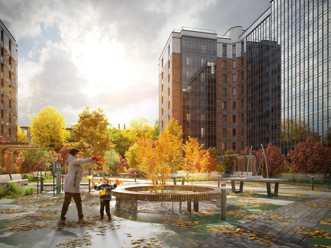 ДВОР: Благоустроенный двор: разновозрастные детские площадки с антитравматическим покрытием, зона street workout: уличные тренажеры и турники, веревочная пирамида, велопарковки, зоны отдыха со скамейками, озеленение территории, малые архитектурные формы. Двор свободный от машин. Дренажная система ''двор без луж''.