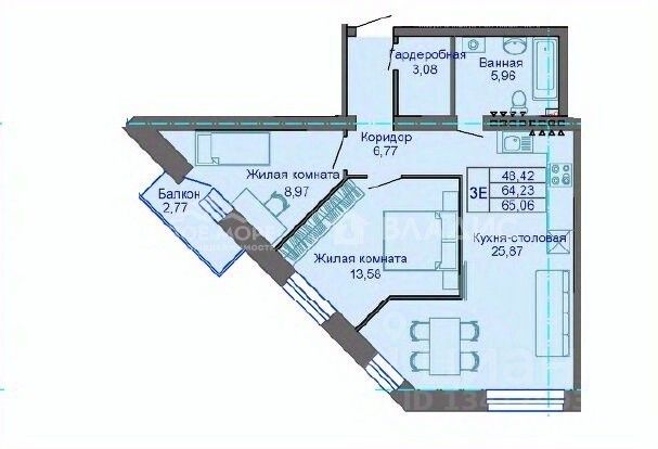 Эта просторная квартира общей площадью 64 кв. м расположена на втором этаже пятиэтажного современного дома.