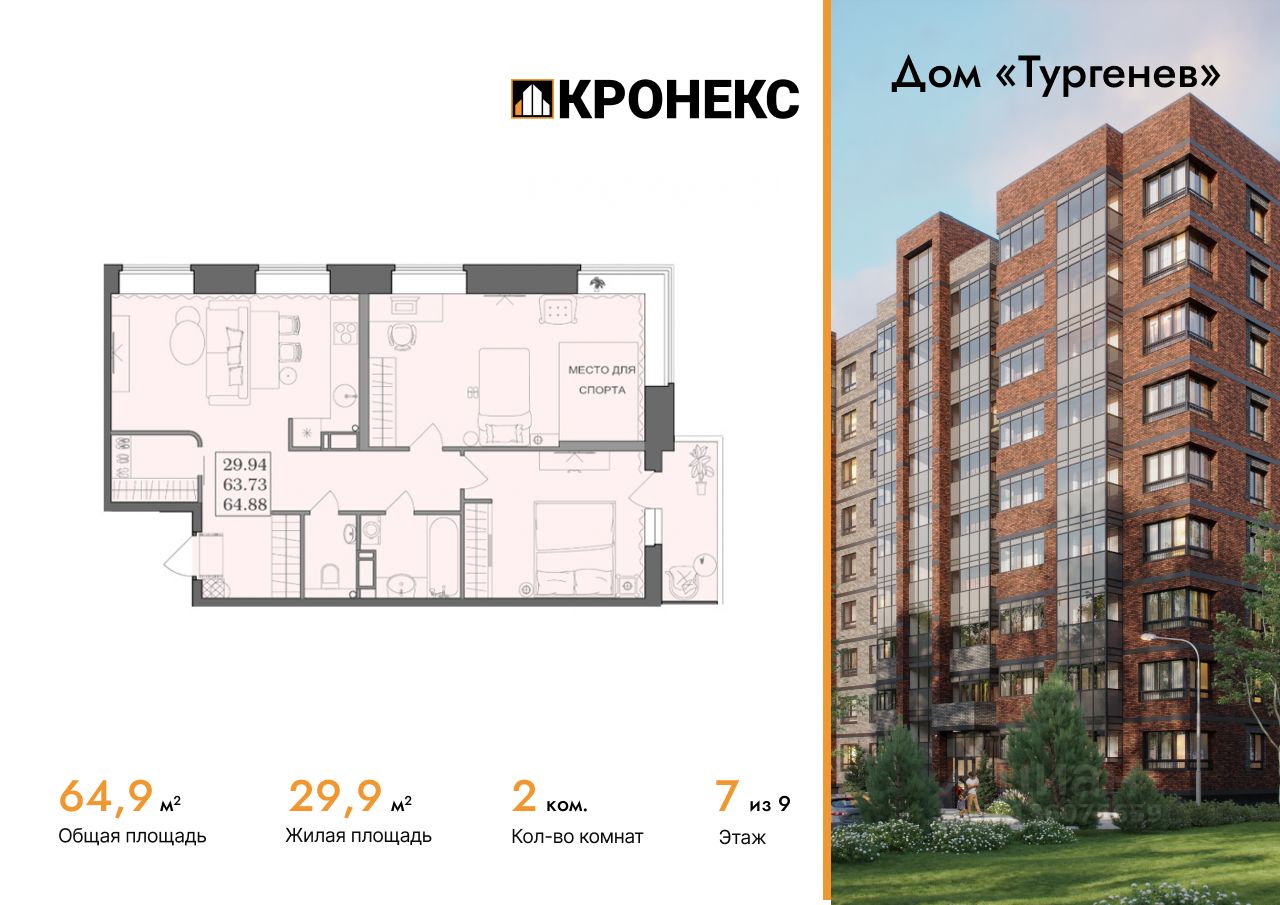 Продается 2-комн. кв-ра площадью 64.88 кв.м на 7 этаже 9 этажного монолитно-кирпичного дома в Дом ''Тургенев'' от ГК Кронекс. Свежий воздух и живописные виды каждый день! Авторский дом ''Тургенев'' идеальное расположение для тех, кто ценит природу! Расположен в уютном квартале рядом с лесом, рекой и озерами. 9-этажный дом возвышается над окружающими его малоэтажками, открывая свободный обзор с любого уровня. Все окна выходят во дворы и находятся на большом расстоянии от ближайших зданий.