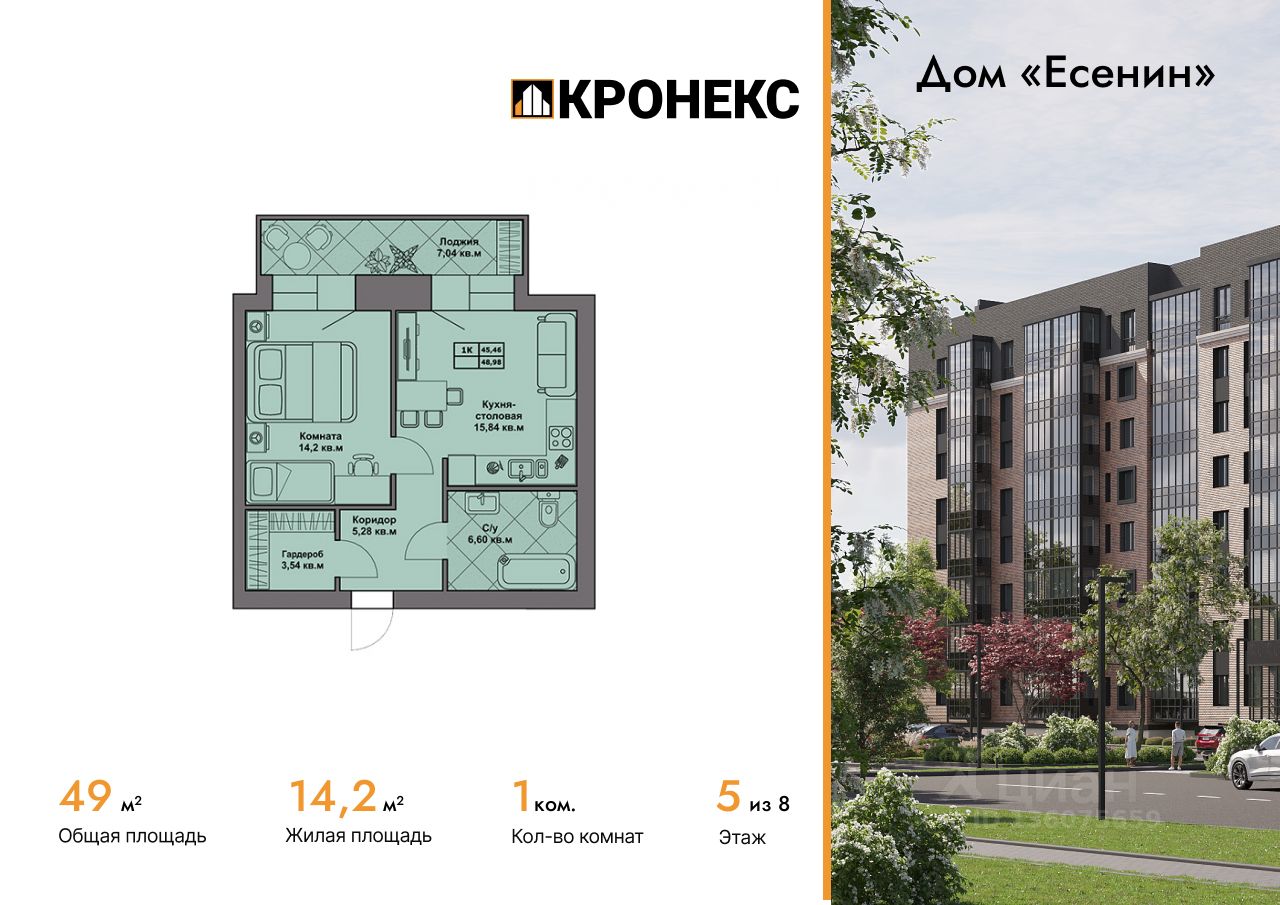 Продается 1-комн. кв-ра площадью 48.98 кв.м на 5 этаже 8 этажного кирпичного дома в Дом ''Есенин'' от ГК Кронекс. Добро пожаловать в авторский дом ''Есенин'' новое слово в городском комфорте.