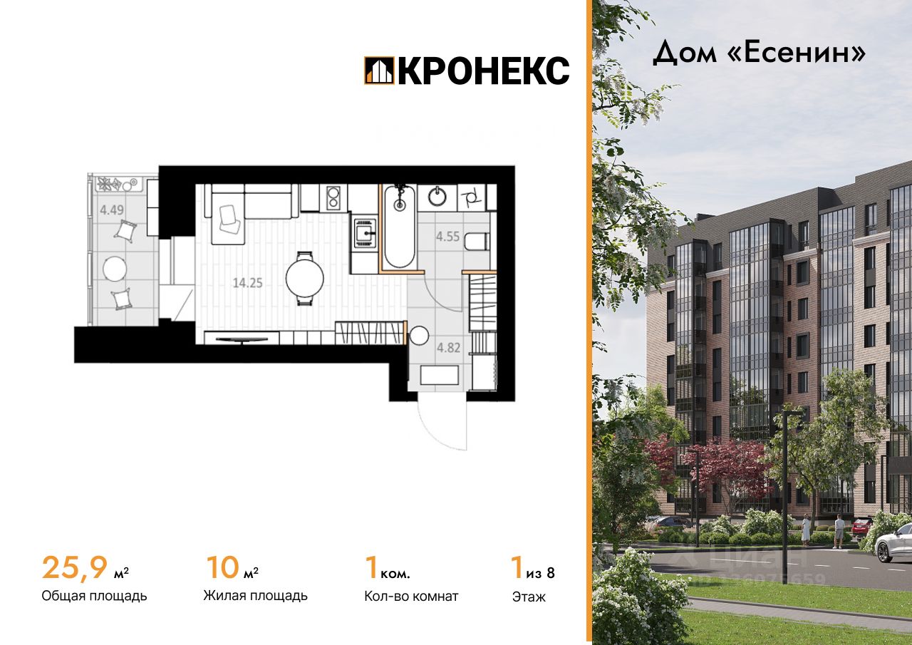 Продается квартира-студия площадью 25.87 кв.м на 1 этаже 8 этажного кирпичного дома в Дом ''Есенин'' от ГК Кронекс. Добро пожаловать в авторский дом ''Есенин'' новое слово в городском комфорте.
