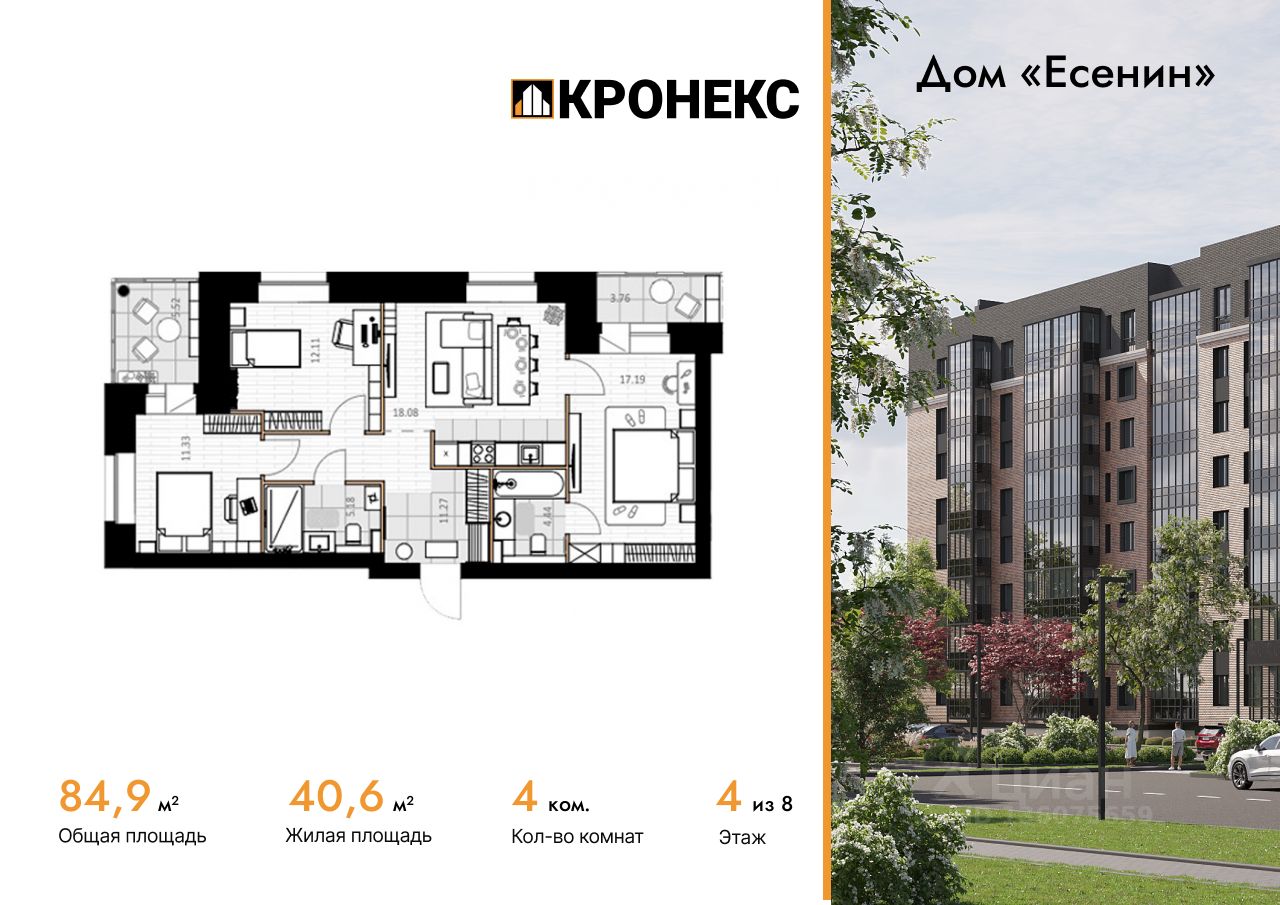 Продается 4-комн. кв-ра площадью 84.89 кв.м на 4 этаже 8 этажного кирпичного дома в Дом ''Есенин'' от ГК Кронекс. Добро пожаловать в авторский дом ''Есенин'' новое слово в городском комфорте.