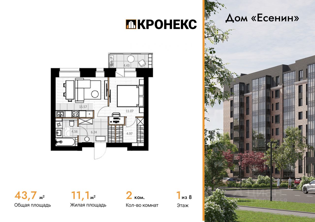Продается 2-комн. кв-ра площадью 43.68 кв.м на 1 этаже 8 этажного кирпичного дома в Дом ''Есенин'' от ГК Кронекс. Добро пожаловать в авторский дом ''Есенин'' новое слово в городском комфорте.