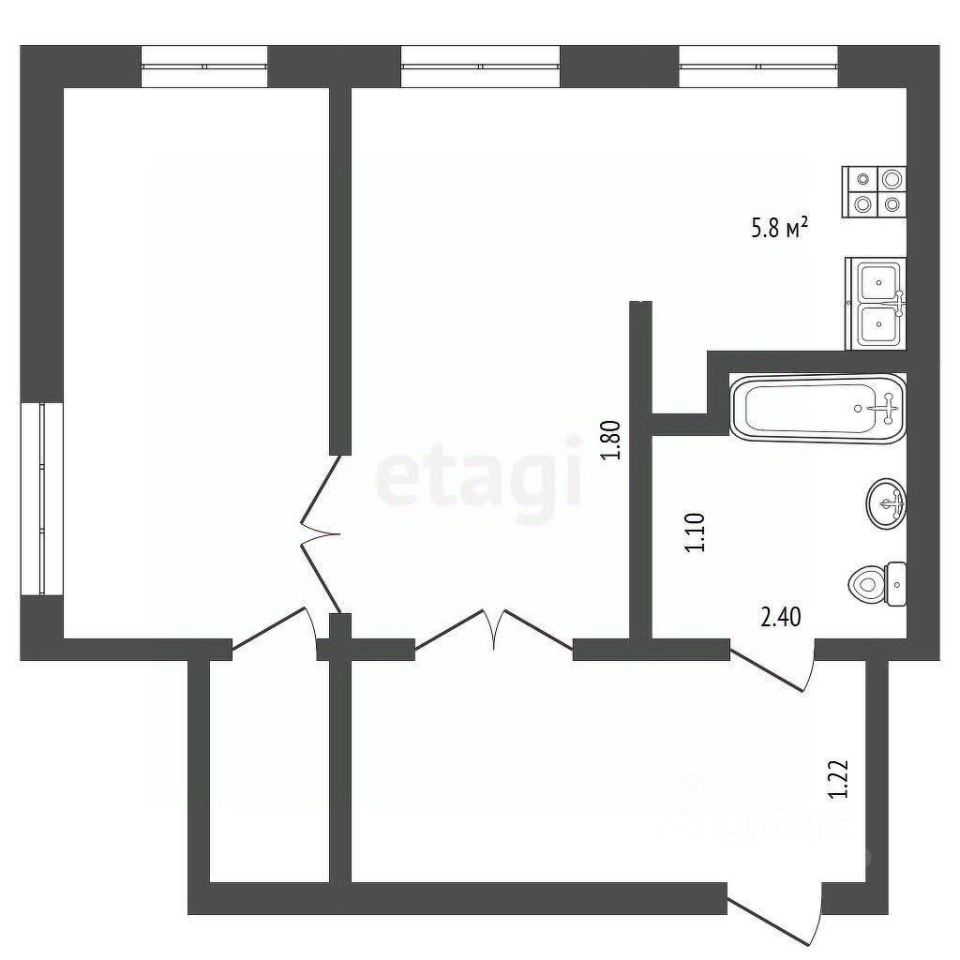 Кухонная зона позволит грамотно распределить рабочую зону и зону приема пищи. Санузел просторный и максимально удобный для размещения сантехнических принадлежностей.