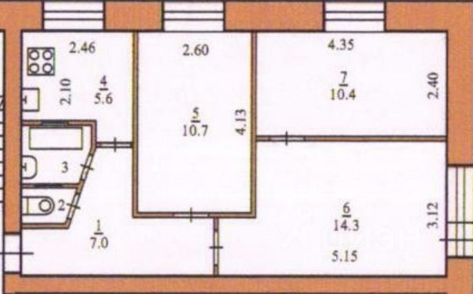Квартира в жилом состоянии, площадь 51,2 кв.м, жилая 35,4 кв.м (комнаты 14,3+10,4-10,7 кв.м), кухня 5,6 кв.м, окна выходят на разные стороны дома!