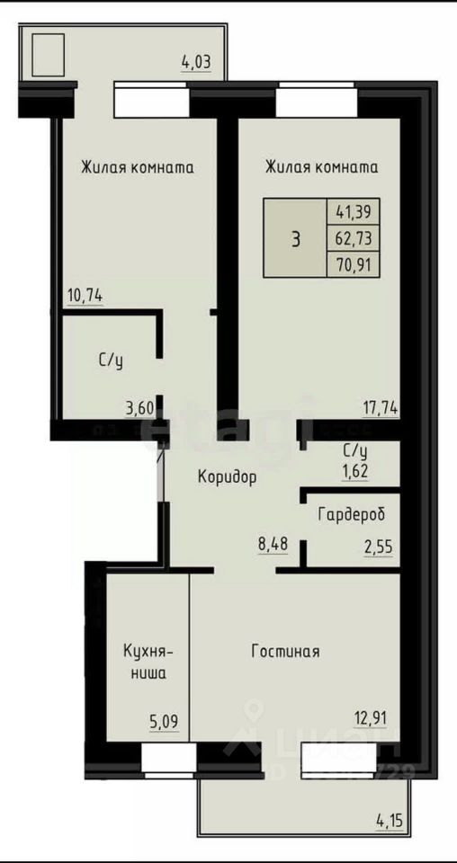 Просторная 3-комнатная квартира 70,91м² в новом кирпичном доме на Левом Берегу Архангельска.