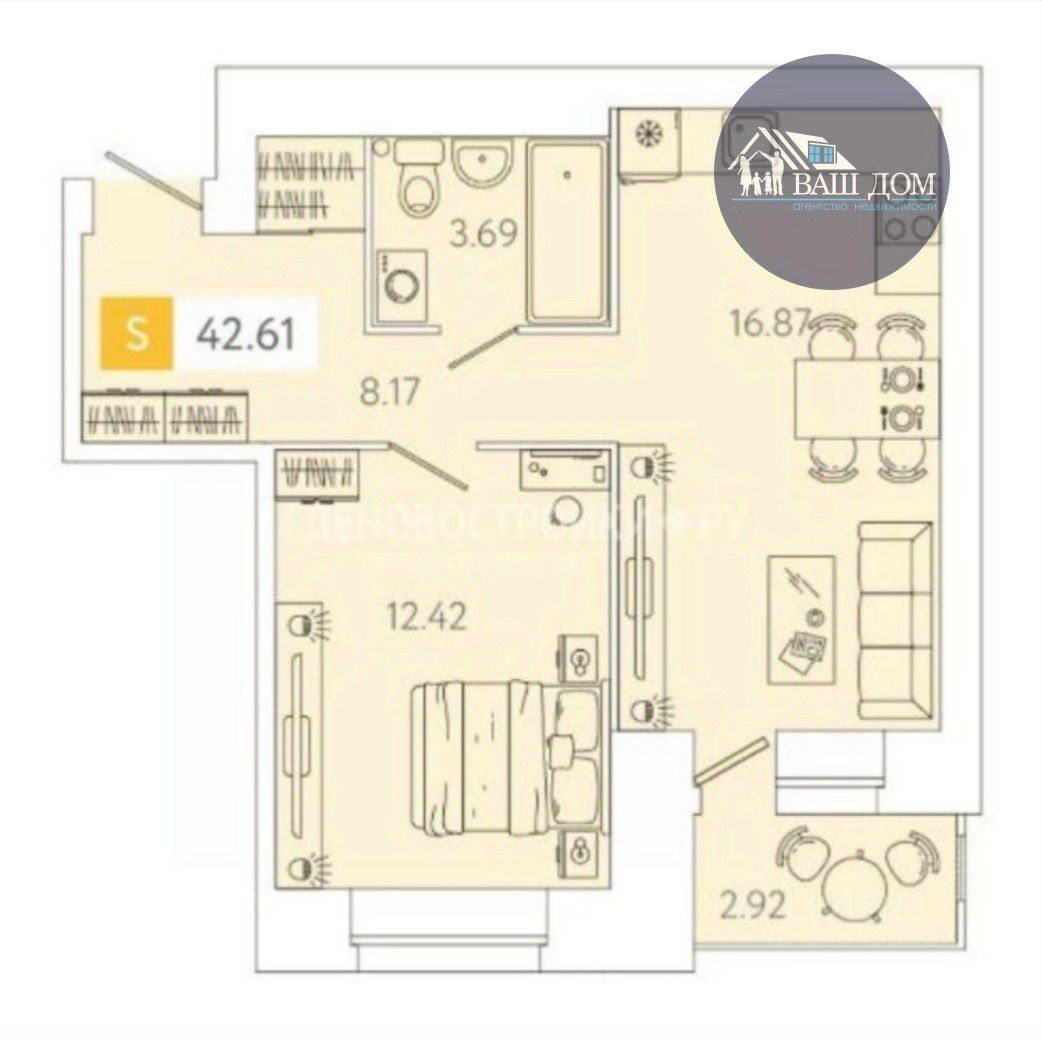 - Практичный коридор (8,17 м2) с местом для хранения. - Гостиная совмещённая с кухней (16,87 м2) с выходом на балкон (3 м2) с панорамным остеклением - готовая релакс-зона. - Изолированная комната (12.42 м2) - Санузел (3,69 м2)